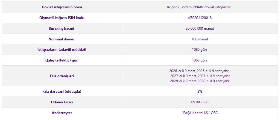 İstiqrazların buraxılış parametrləri barədə məlumat aşağıdakı cədvəldə verilmişdir: